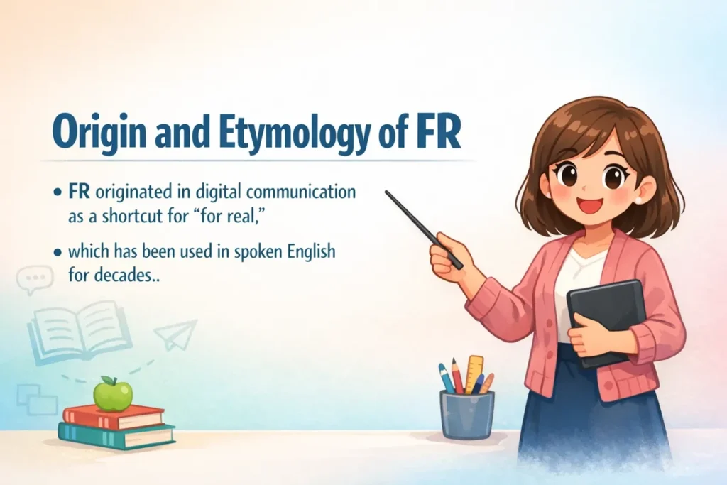 FR originated in digital communication as a shortcut for “for real,” which has been used in spoken English for decades. The phrase became popular in texting and online chat to quickly express sincerity.